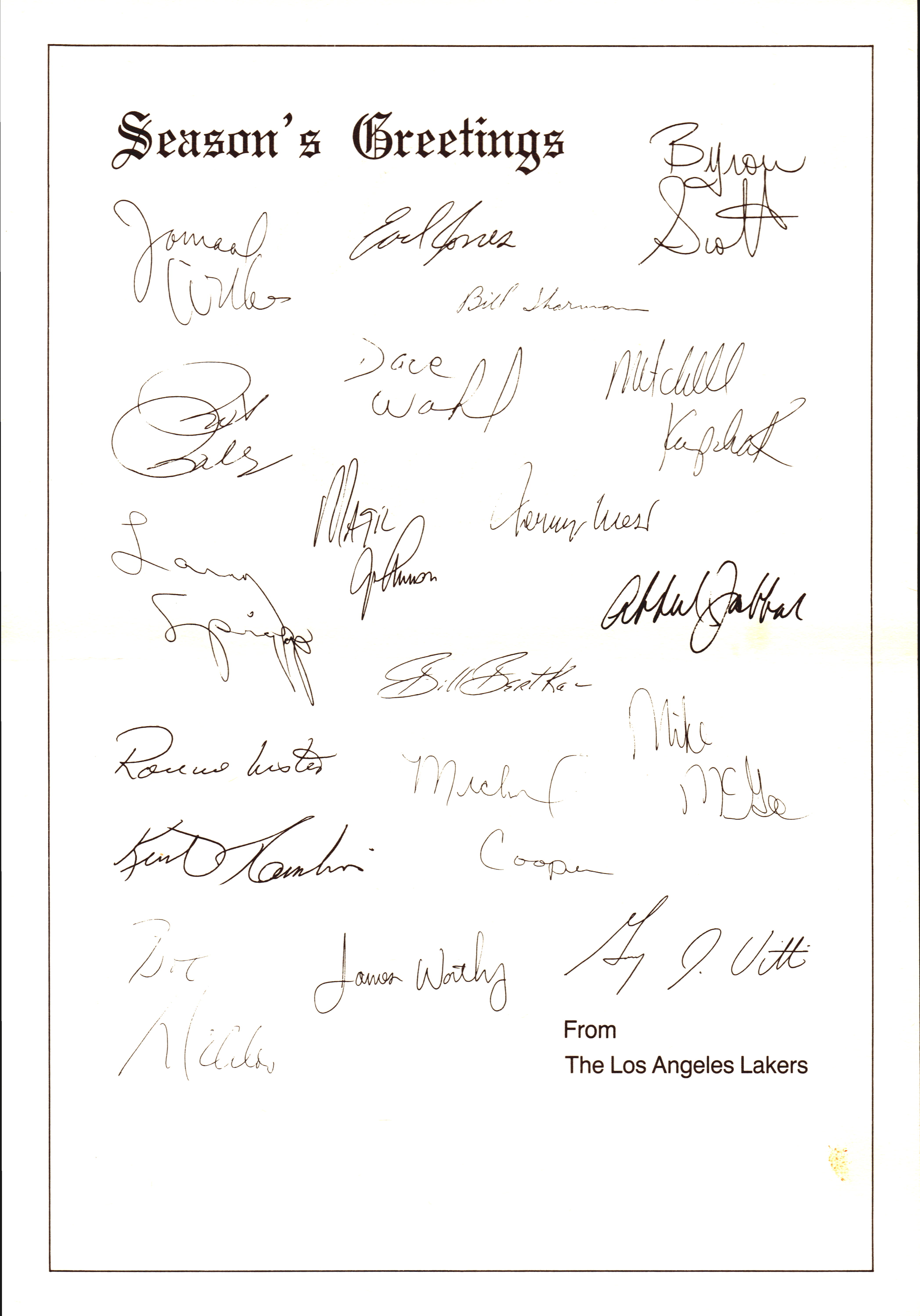 Today I decided to look for something specific (which I did not find) and came across this holiday greeting card (it didn’t mention Christmas, so we know the Lakers are snowflakes and commies) I received and saved. I have looked at the Lakers’ roster for several years and I’m pretty sure this is from the mid-80s, though I can’t pin down the specific year. Maybe someone else can.