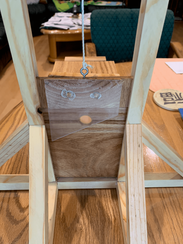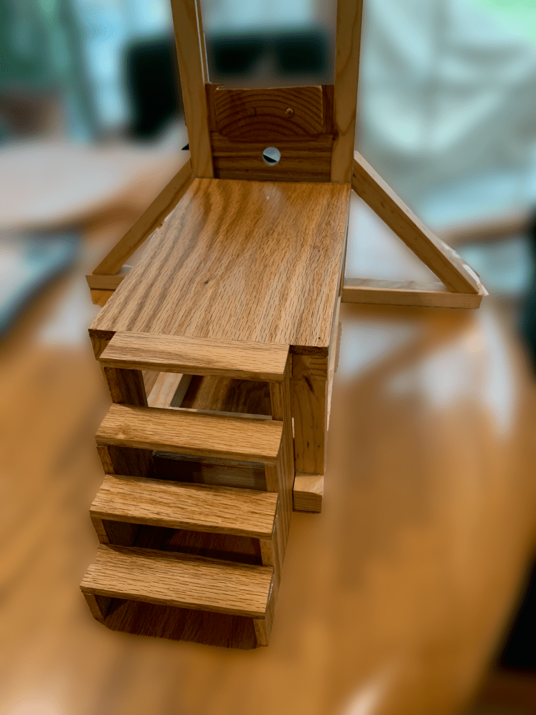 Here, the guillotine is mostly finished and assembled. You can see I was making a set of stairs, which I hadn’t planned on doing, but my daughter insisted was necessary.I made the blade out of plastic, so it’s incapable of cutting, the spacer out of some Oak I had to purchase to get the 1/4″ thickness I needed for a few pieces, and I made the counterweight out of a piece of 2×4 that’s probably been sitting in our garage for the last two decades.If you compare the stairs to what I started with and have depicted in the first photo, above, you’ll note I ultimately ended with four steps. I think it was because I realized I’d made them too tall to begin with and had to scale them down. The steps and the table/platform are made of Oak and here the whole thing has been treated with Watco Danish oil.Getting the blade to actually drop was a bit of a challenge because cutting the channels on the two uprights so the blade assembly would be able to slide smoothly up and drop fairly quickly down was challenging, and they weren’t quite as smooth as I would have liked them to be. Nevertheless, I got it done after a bit of trial and error.