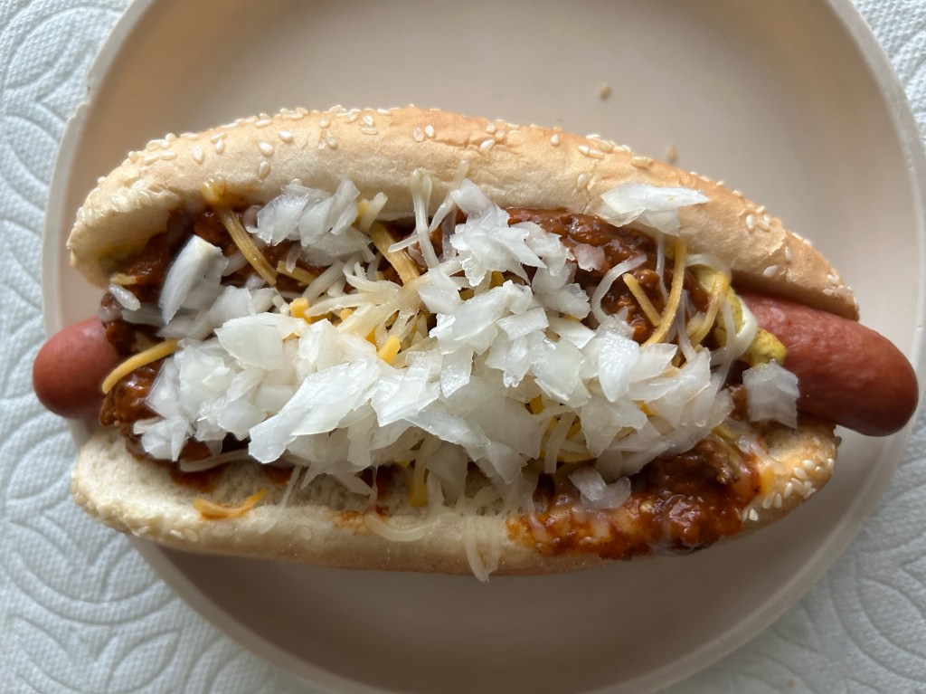 Perfect hurriquake lunch. Hoffy all-beef, natural casing hot dog, Francisco seeded bun, Gulden’s spicy brown mustard, Hormel chili (no beans), Trader Joe’s Mexican cheese blend, and freshly chopped onion.