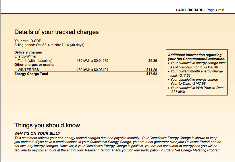 Just received our latest electricity bill from Southern California Edison. Our total charges for delivery are $1.77, which is applied to a current credit balance of just over $200.00. Now that we’ve returned to bundled service from SCE, which means we are totally on a net energy metering account, we are consistently producing more energy than we’re consuming. I have been keeping close track of our total expenses since we had net metering fully enabled and I’m projecting we will save approximately $2,000 over last year’s bill. Think about that. This includes the amount we pay each month on the lease of the solar panels which, since we use a lot of energy, is a large system and is more than some people we know ever spend on a month’s worth of energy.