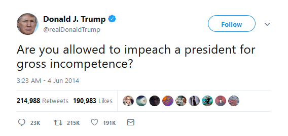 I just came across this tweet from Teh Donald™, which I’m quite sure is part of the collection of tweets where he has previously said something about someone else (usually Obama) that is actually applicable to his presidency. Donald John Trump has severely wounded irony and satire. It remains to be seen if we’ll ever recover a normal, decent sense of humor.