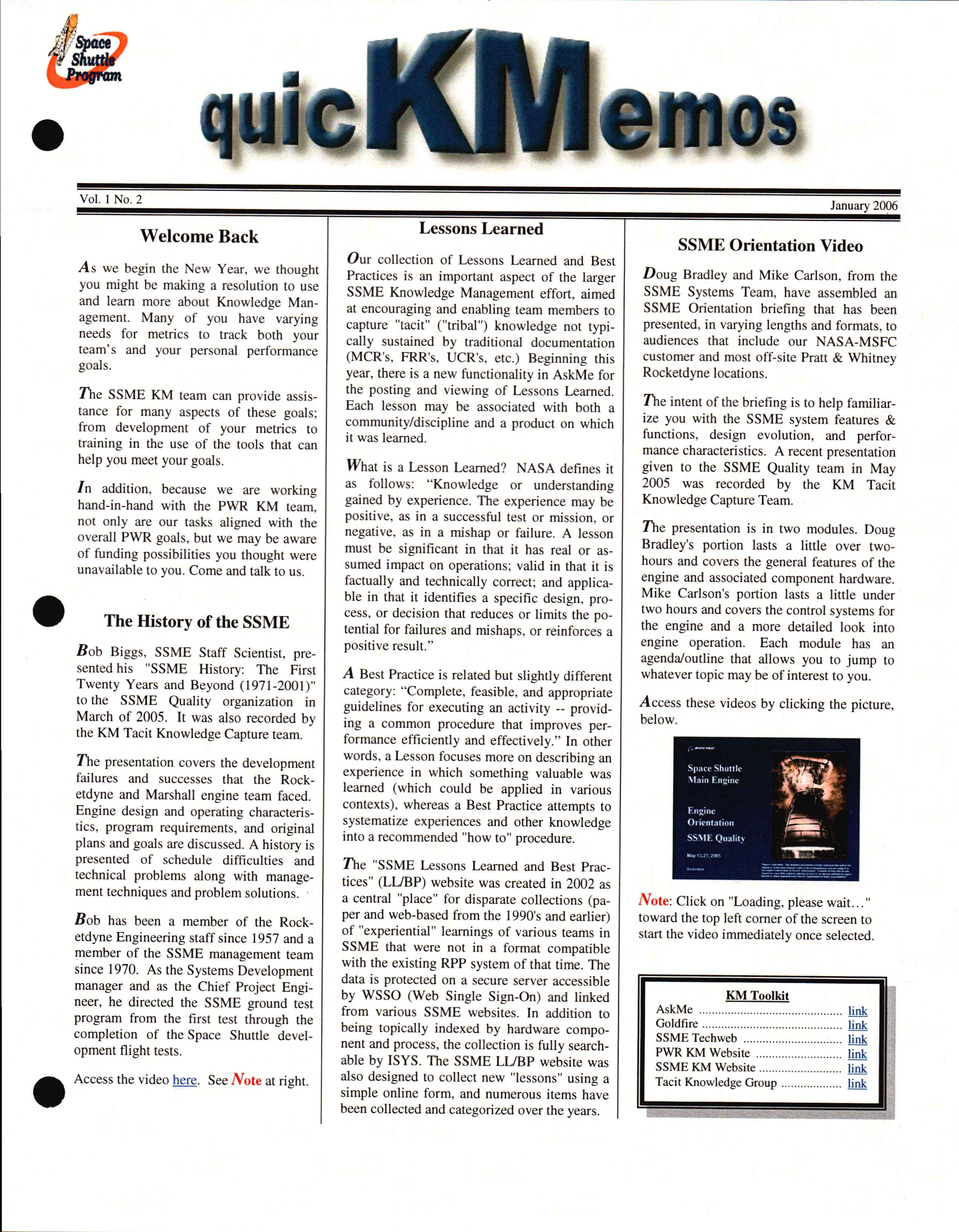 Here’s the second issue of the KM newsletter I wrote and published for the SSME KM team. This one was for January of 2006. The middle column has a couple of decent descriptions of “Lessons Learned” and “Best Practices.” What it doesn’t address, which is something many of us came to understand later, is that we don’t actually want “Best” Practices; which implies there won’t be any room for improvement, as “best” is a superlative adjective, which means it just doesn’t get any better than best. We, therefore, preferred to talk about “Better” Practices, which also fits rather nicely into the philosophy of continuous improvement. My apologies if this is boring.
